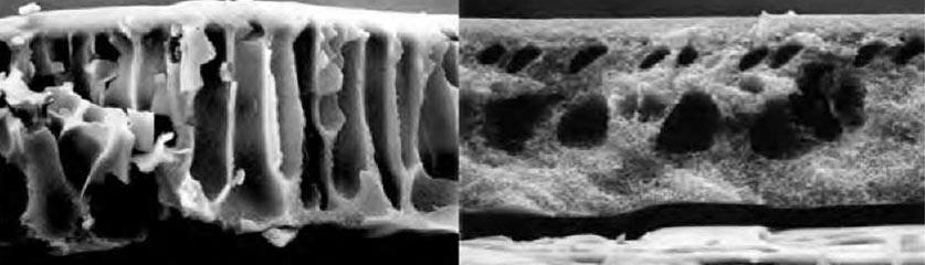 對于微孔濾膜過濾器,孔結構的范圍從聚碳酸酯和聚酯軌跡蝕刻膜的基本上二維的篩狀結構到膨脹的PTFE膜的節(jié)和卷須結構,再到聚丙烯腈的糾纏納米纖維結構。 (PAN)膜,以及溶劑澆鑄膜(如醋酸纖維素(CA))的褶皺花邊狀泡沫狀結構。
