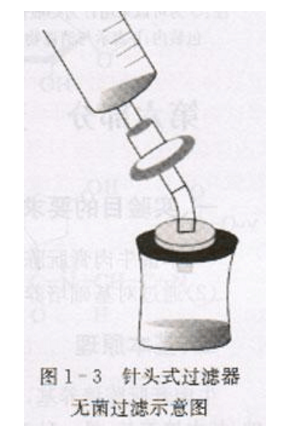 將滅菌濾器的進口在無菌條件下以無菌操作方法銜接于裝有待濾溶液(2%葡萄糖溶液)的注射器上,將針頭與出口處銜接并刺進帶橡皮塞的無菌容器中(圖1一3)。 3.壓濾